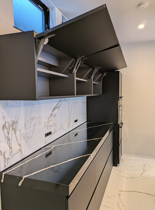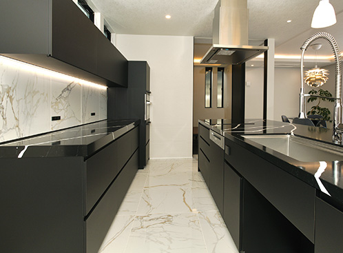 天板はアイランドキッチンと同じ天然石の美しさと高い耐久性を兼ね備えた人造石のサイルストーン。強い黒の背景色に説得力のある強い白のディテールとハイライトが表面に浮き出ていて空間と調和する造形美を叶えています。