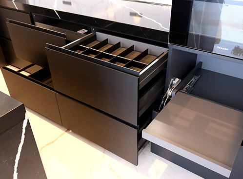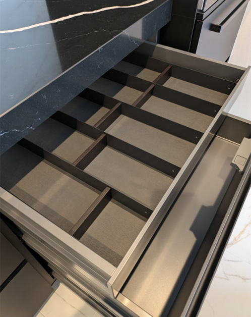 カップボードの上段の引出しには内引出しを設置し仕切りシステム「SiKiLiNa」をセット。エッジの効いたスチールと無垢材のピースをマグネットで組み立てるだけでお持ちのカトラリーなど綺麗に収納ができます。