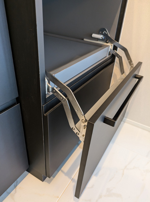 炊飯器はスイングリフトダウン扉 奥のスライド棚に置くことで、手前に引き出して炊飯することが可能です。