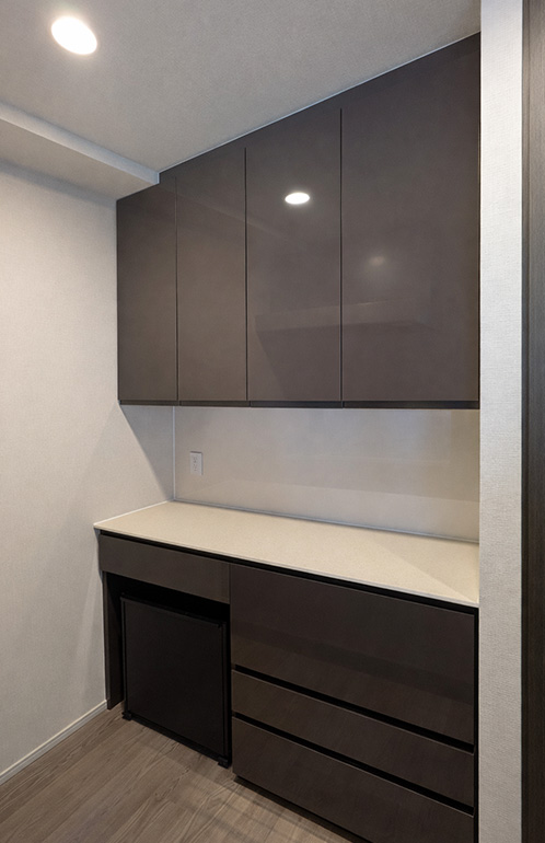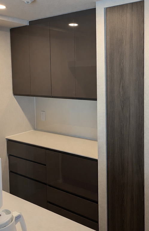 空間全体のトーンに合わせ、落ち着きのあるダークカラーの扉材を採用。カウンタートップには石目柄の人工大理石を用い、重厚感と上質感を兼ね備えた意匠としています。