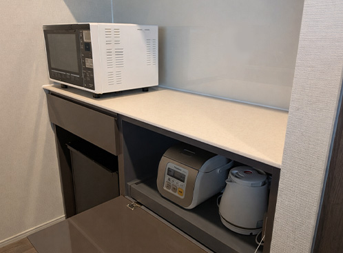 家電配置については、電子レンジ置き場を確保しつつ、炊飯器や電気ポットなどは視線から隠れるよう計画し、生活感を抑えた端正な佇まいを実現しています。