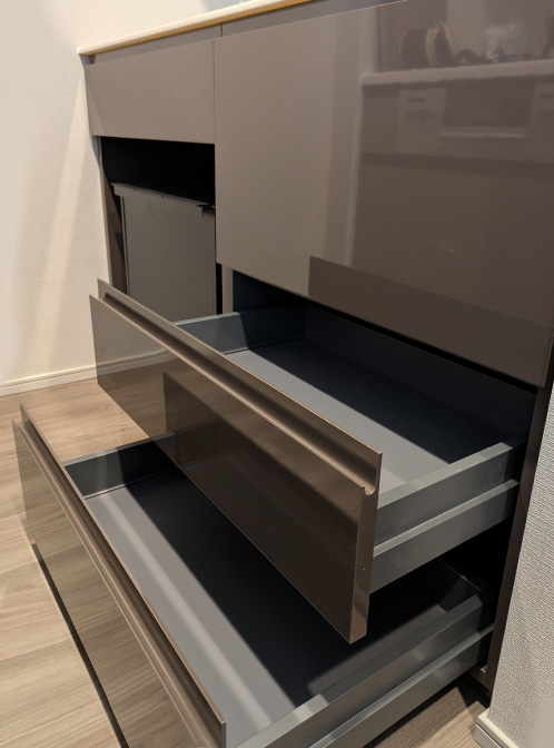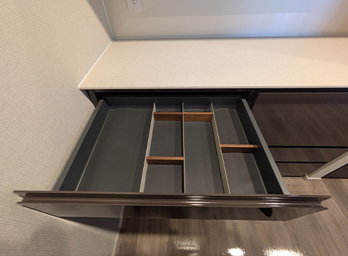 引出し部分にはカトラリー収納を設け、内部仕切りを可変できる仕様とすることで、ライフスタイルに合わせた使い勝手に対応。