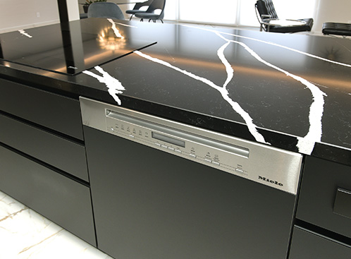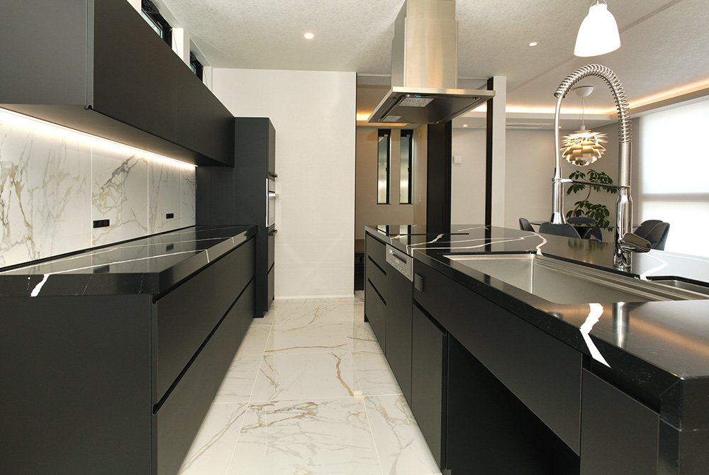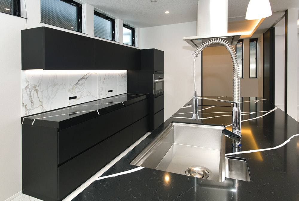 新築計画の中で、リブランのホームページをご覧になりオーダーキッチンのご相談をいただきました。展示を見ながらお話を重ねる中で、デザイン性だけでなく、お手入れのしやすさや日々の使い勝手にも気を配りたいというお気持ちが明確になっていき、シンク・レンジフード・IHの特徴や清掃性を比較しながら、お客様ご自身で一つ一つ丁寧に選ばれていきました。ミーレの電子レンジ機能付オーブンは、調理や取り出しがしやすい高さにビルトイン。食洗機はご家族との時間を大切にしたいという想いから大容量のMiele 60cmタイプを選択。水栓金具はプロの厨房のような雰囲気を持ちながらも、洗練されたデザインのGROHEを採用いただきました。LDKで存在感を放つキッチンの天板とサイドパネルは天然石の美しさと高い耐久性を兼ね備えた人造石のサイルストーン。傷や汚れに強く、日常のお手入れも簡単な素材です。天板とサイドパネルを同素材にすることで空間と調和する造形美を叶えています。